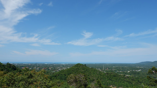Saat berada di puncak bukit, Penulis tertegun takjub dengan pemandangan yang tersaji. Pohon-pohon hijau yang diselingi dengan atap rumah warga, lalu di ujung sana terlihat pemandangan air laut berwarna kebiruan. Di Puncak Bukit Fathin San terdapat Patung Budha berwarna emas dan berukuran besar, dikelilingi dengan tiang-tiang penyangga berwarna merah.